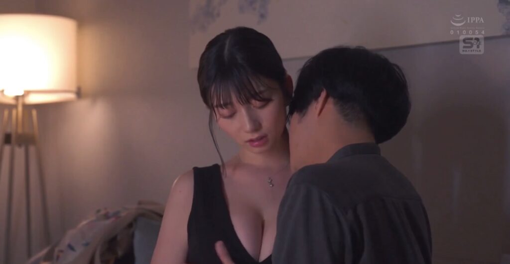 男性客の泊ってるホテルに派遣されたセトカン。長いコートを脱ぐと、ピチピチの黒の短いキャミソール姿で体のラインがはっきりわかる。髪を後ろで束ねてる姿が少し大人っぽい印象を与える。